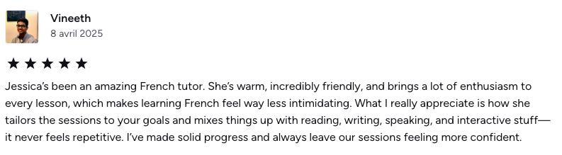 Débutant ou avancé, enfant ou adulte, chaque leçon est conçue pour vos besoins. Jeux, exercices pratiques, conversations réelles et suivi personnalisé : tout est pensé pour que vous constatiez des progrès dès les premières séances.